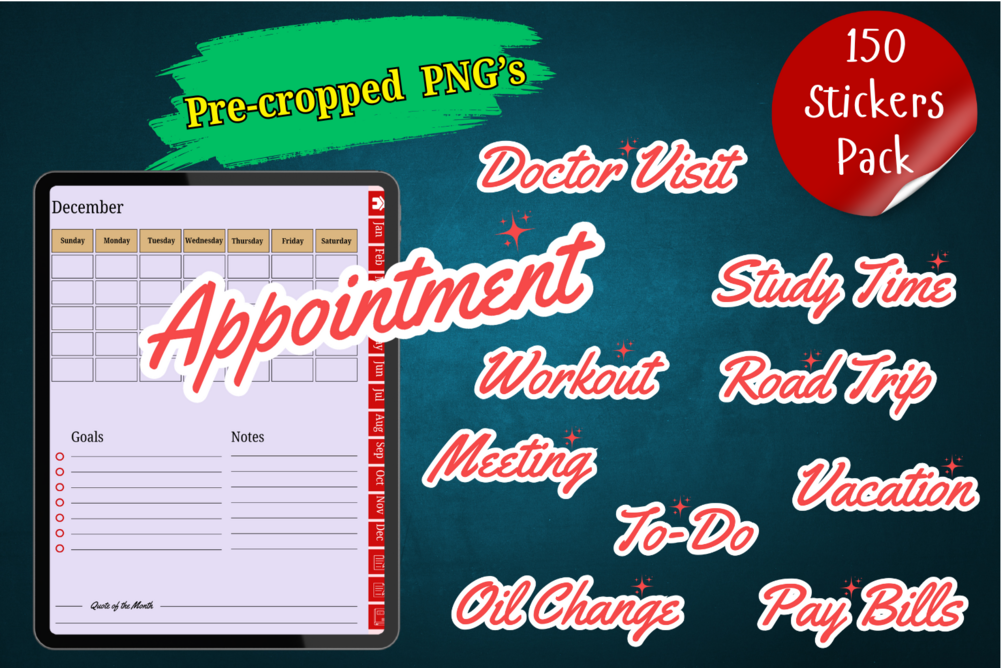 • A zipped file of 150 individual pre-cropped PNG images with transparent backgrounds designed to be used in a PDF annotation app (Goodnotes, Zoomnotes, Penly, Notability, Noteshelf, XODO, etc.) with a digital planner of your choice